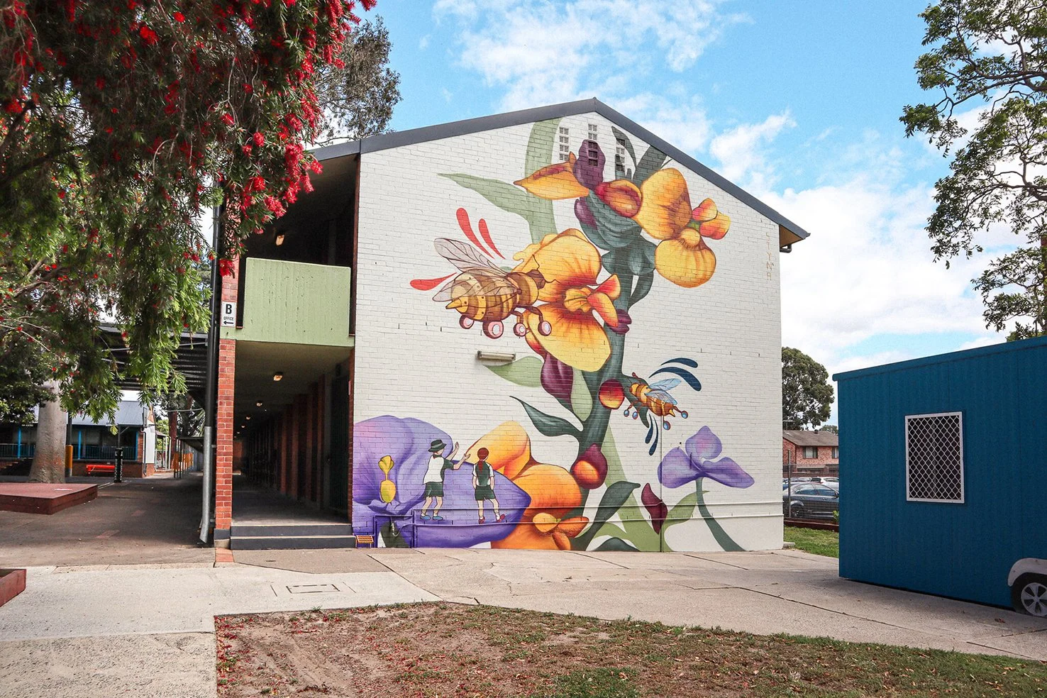 The Launch of the Pollinators mural shows a story of the children of Ingleburn Public who ensemble mechanical pollinators in the form of honey bees to go forth and pollinate a stem of Gorse Bitter peas, colloquially termed 'bacon and eggs'. The Gorse Bitter Pea is an erect spiky shrub about 1 metre tall. It is small, yellow with red-brown petals in colour and a plant that is encouraged to be grown in the gardens of the local Campbelltown area. It is the heart and high spirits of the kids of IPS that inspired the design as well as the four pillars of the school: Empowerment, Global Citizen, Innovation and Collaboration.