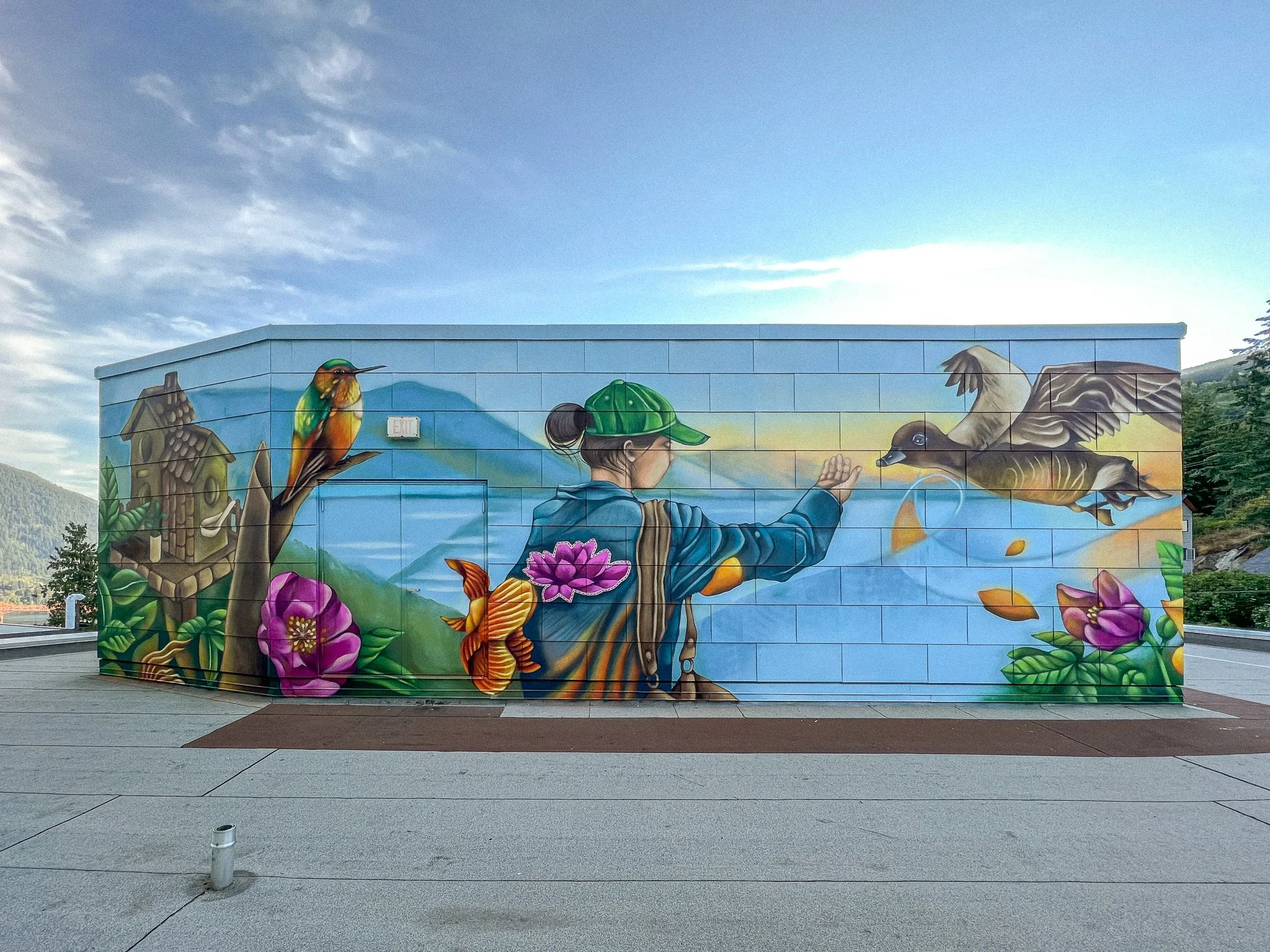 The left-hand side of the wall explores surreal elements (a goldfish that swims through wild roses and Lewis's mock-orange between a birdhouse made from recycled corkscrews and a soup spoon). A perched Rufous hummingbird observes the interaction between the main character encountering the flight of an Australian Wood Duck. The symbol of a lotus flower patched on the back of the main character's shirt – represents my Vietnamese Chinese heritage. The lotus is often viewed as a symbol of purity as they rise from the mud without stains. Since they return to murky water each evening and bloom during the day's break, lotus flowers symbolise strength, resilience, and rebirth.